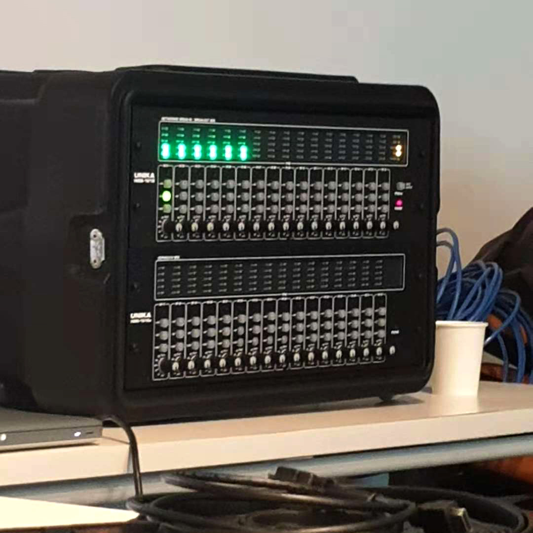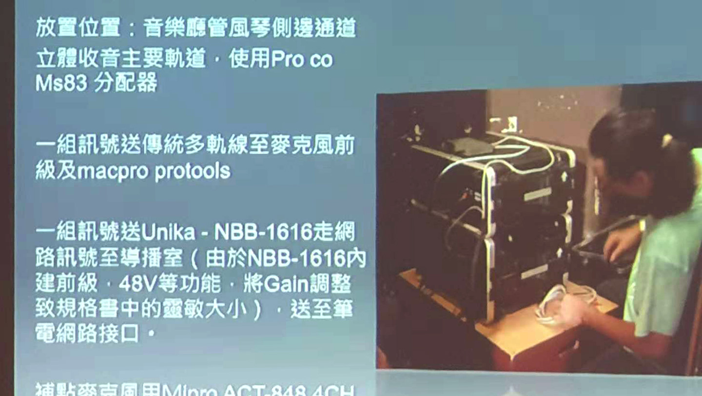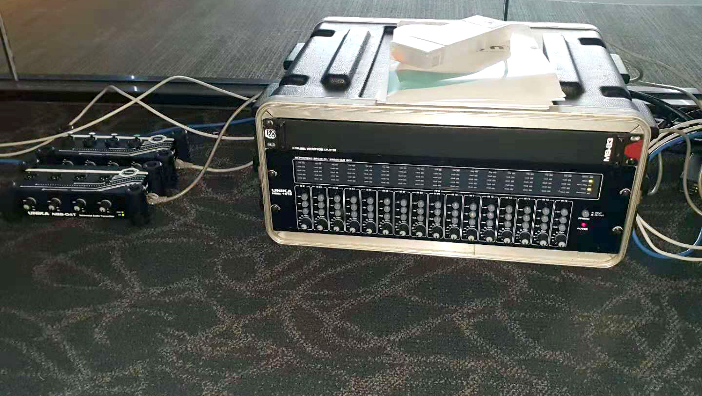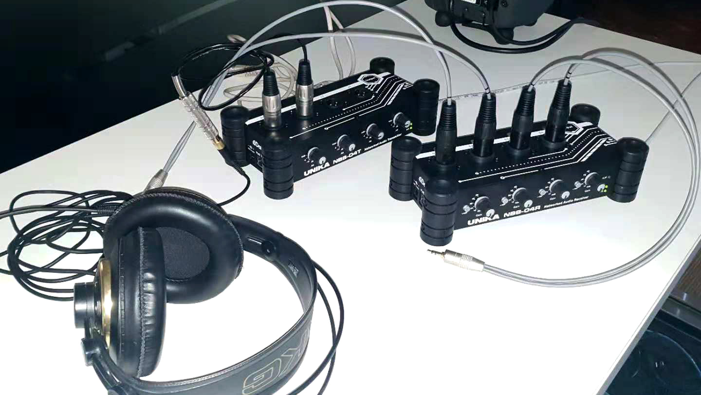 NBB-1616 and NBB-04T, NBB-04R are put under the projector; The NBB-04T and NBB-04R are set up on the left side wall, and the input cables of the mobile phone and the output cables of the earphones are preset; NBB-1616 and NBB-1616e extended box (a total of 32×32 physical channels on this side) are put opposite of the screen side; Recording and playback is performed by the MAC BOOK PRO on the rostrum with Dante Virtual Soundcard and Pro Tools.